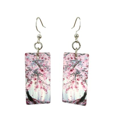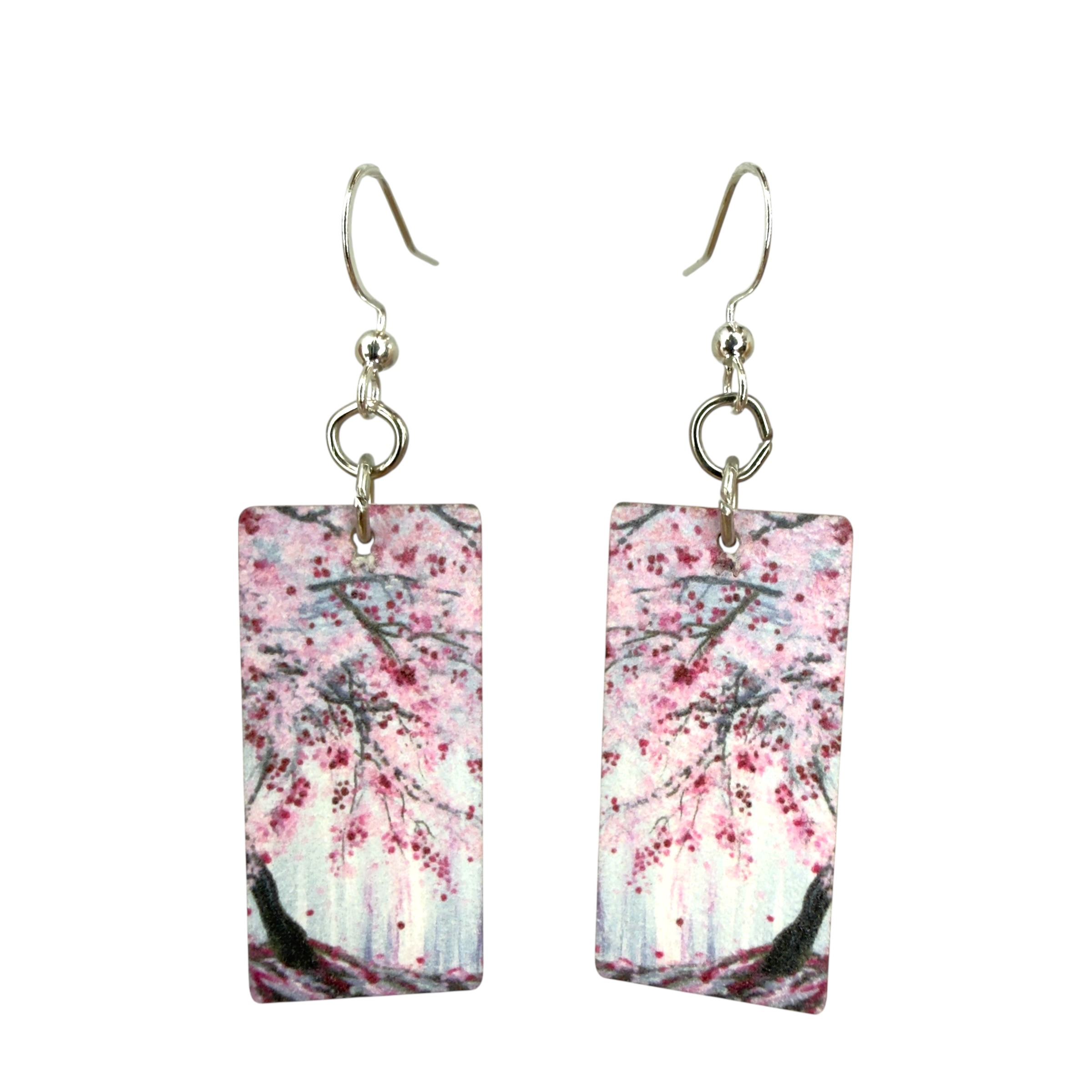 Size: 1.35" H × 0.7" W × 0.1" thick. Material: 100% recycled paperboard with a natural art gallery aesthetic. Ear wires: Silver-finished 304L stainless steel, hypoallergenic. Made in the USA.