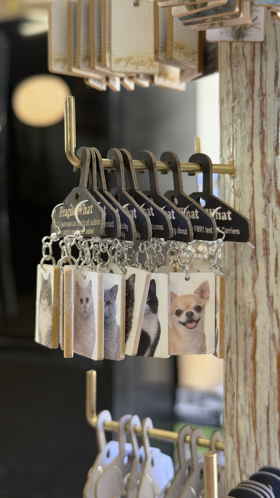 Display: Each pair hangs on a Whimsy Hanger Card with Fragile X awareness messaging — 45 rotating facts that do the storytelling for you.