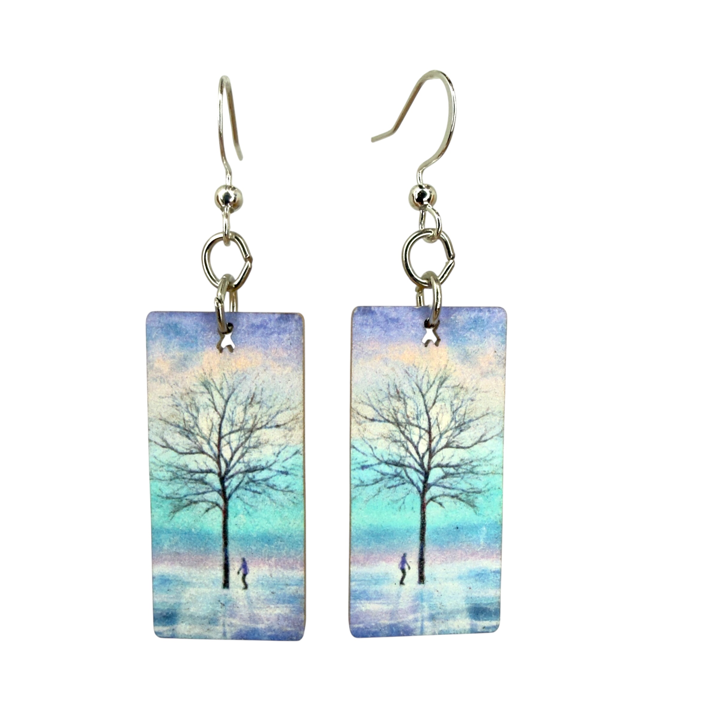 Size: 1.35" H × 0.65" W × 0.1" thick. Material: 100% recycled paperboard with a natural art gallery aesthetic. Ear wires: Silver-finished 304L stainless steel, hypoallergenic. Made in the USA.