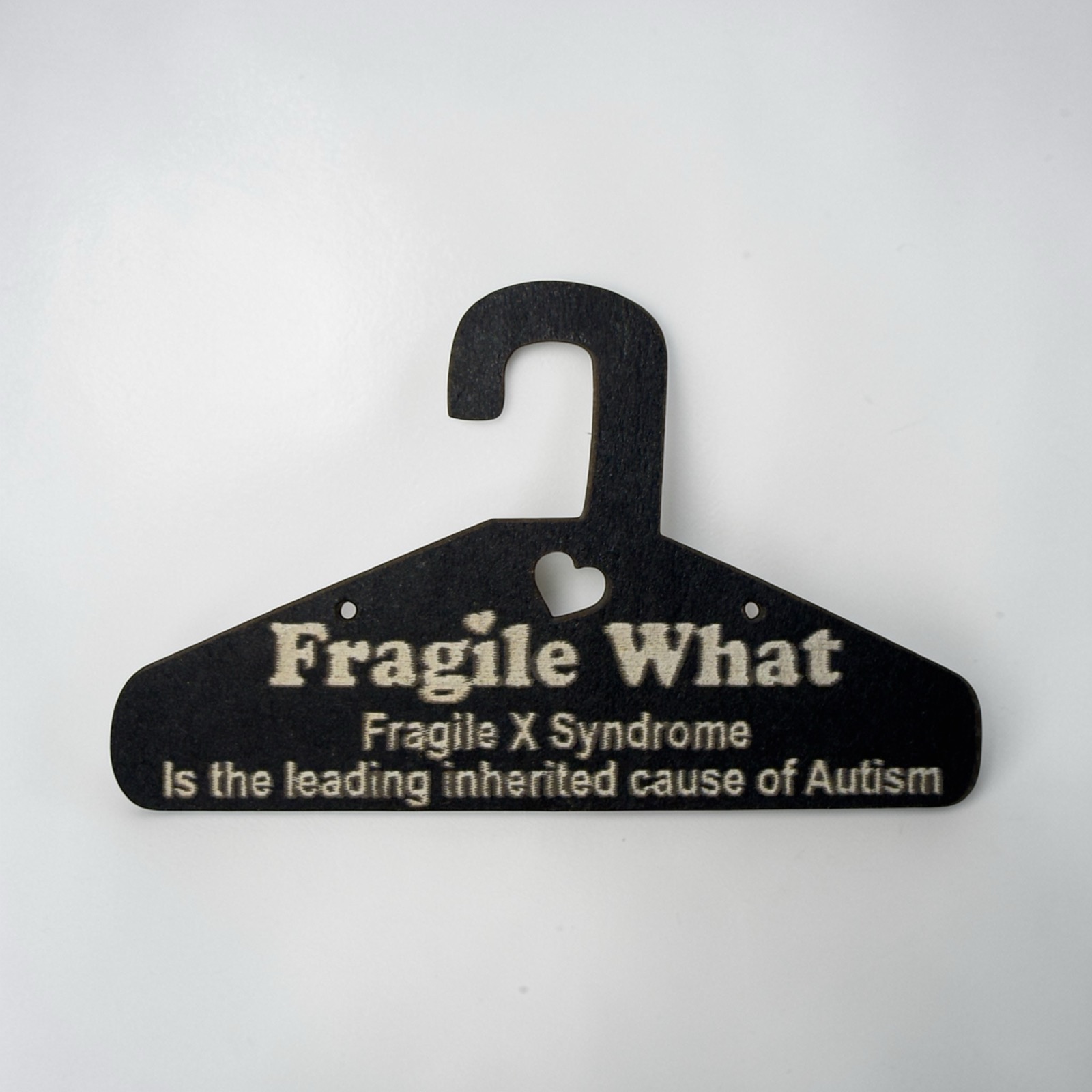 Display: Each pair hangs on a Whimsy Hanger Card with Fragile X awareness messaging — 45 rotating facts that do the storytelling for you.
