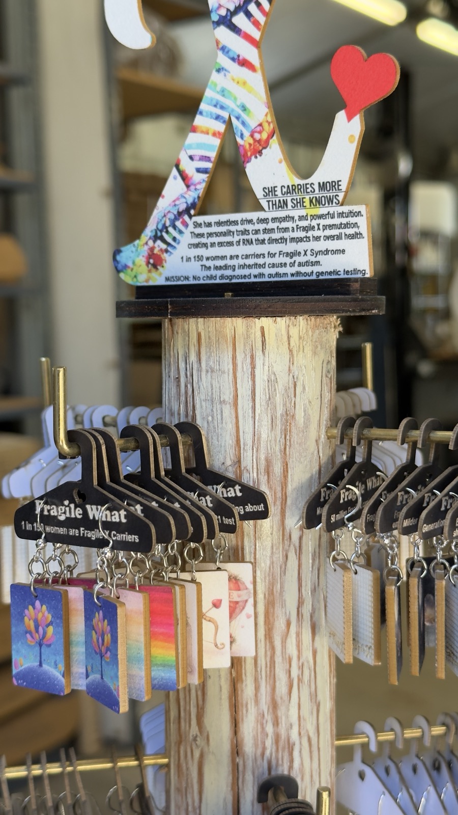 Display: Each pair hangs on a Whimsy Hanger Card with Fragile X awareness messaging — 45 rotating facts that do the storytelling for you.