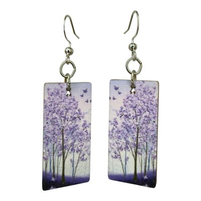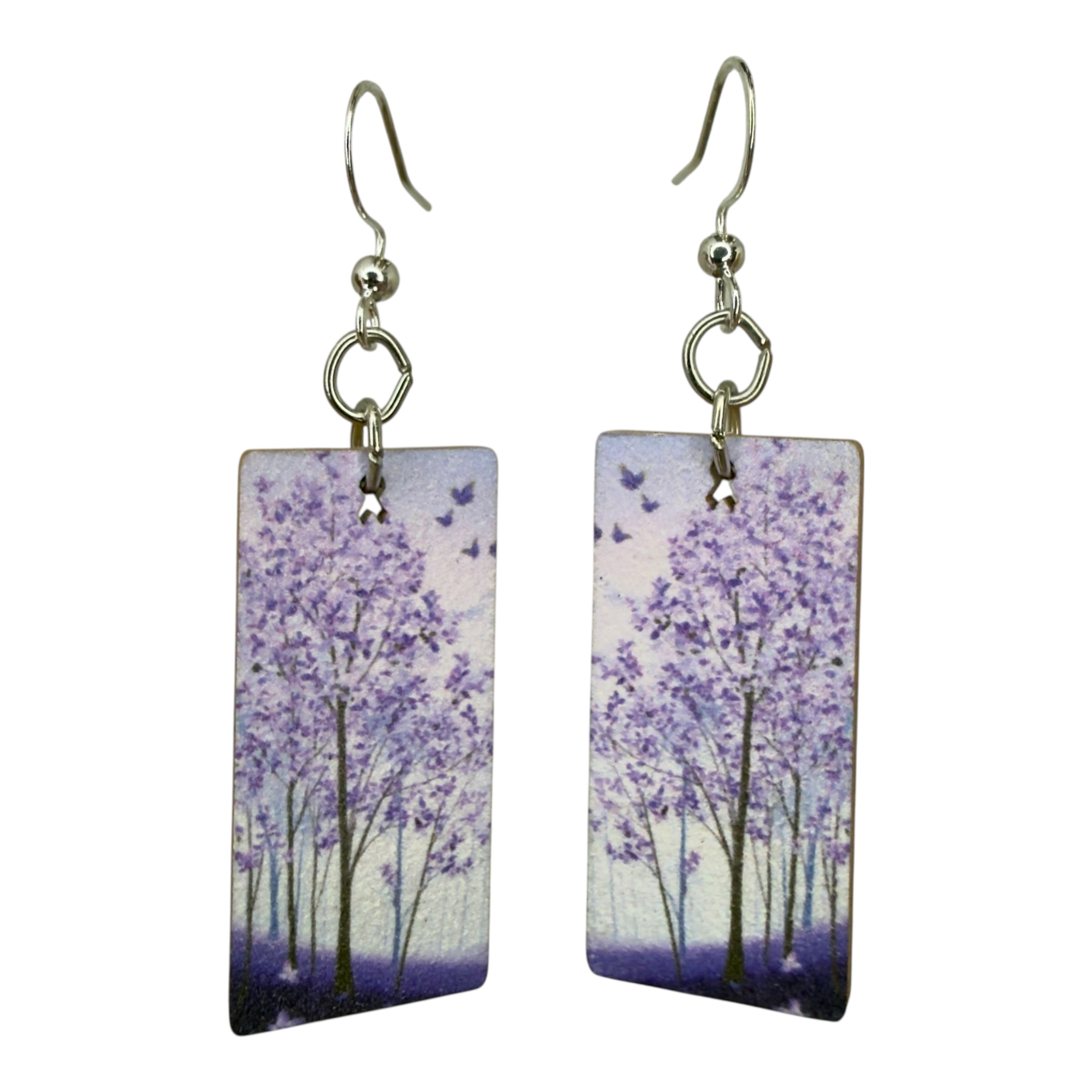 Size: 1.35" H × 0.65" W × 0.1" thick. Material: 100% recycled paperboard with a natural art gallery aesthetic. Ear wires: Silver-finished 304L stainless steel, hypoallergenic. Made in the USA.
