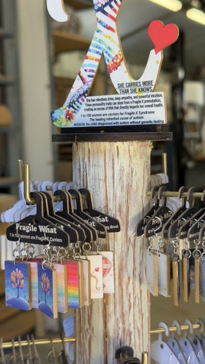 Display: Each pair hangs on a Whimsy Hanger Card with Fragile X awareness messaging — 45 rotating facts that do the storytelling for you.