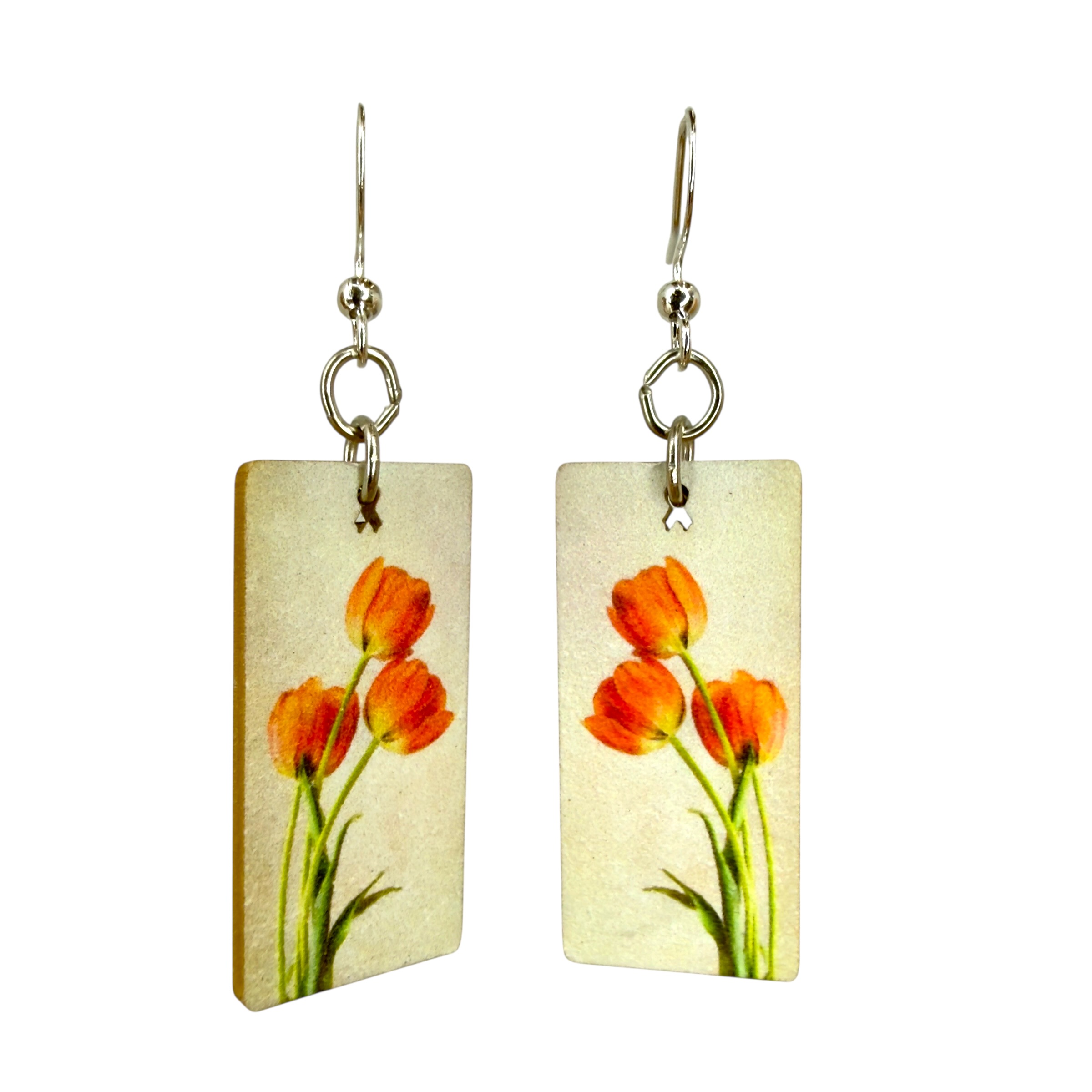 Size: 1.35" H × 0.7" W × 0.1" thick. Material: 100% recycled paperboard with a natural art gallery aesthetic. Ear wires: Silver-finished 304L stainless steel, hypoallergenic. Made in the USA.