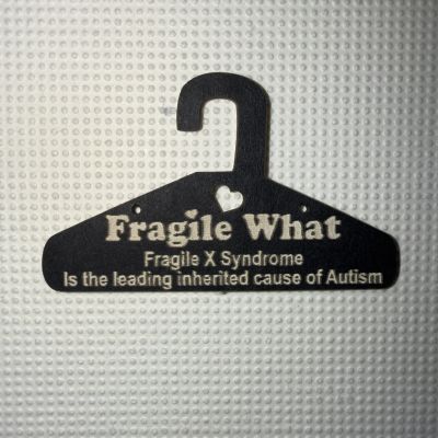 Display: Each pair hangs on a Whimsy Hanger Card with Fragile X awareness messaging — 45 rotating facts that do the storytelling for you.