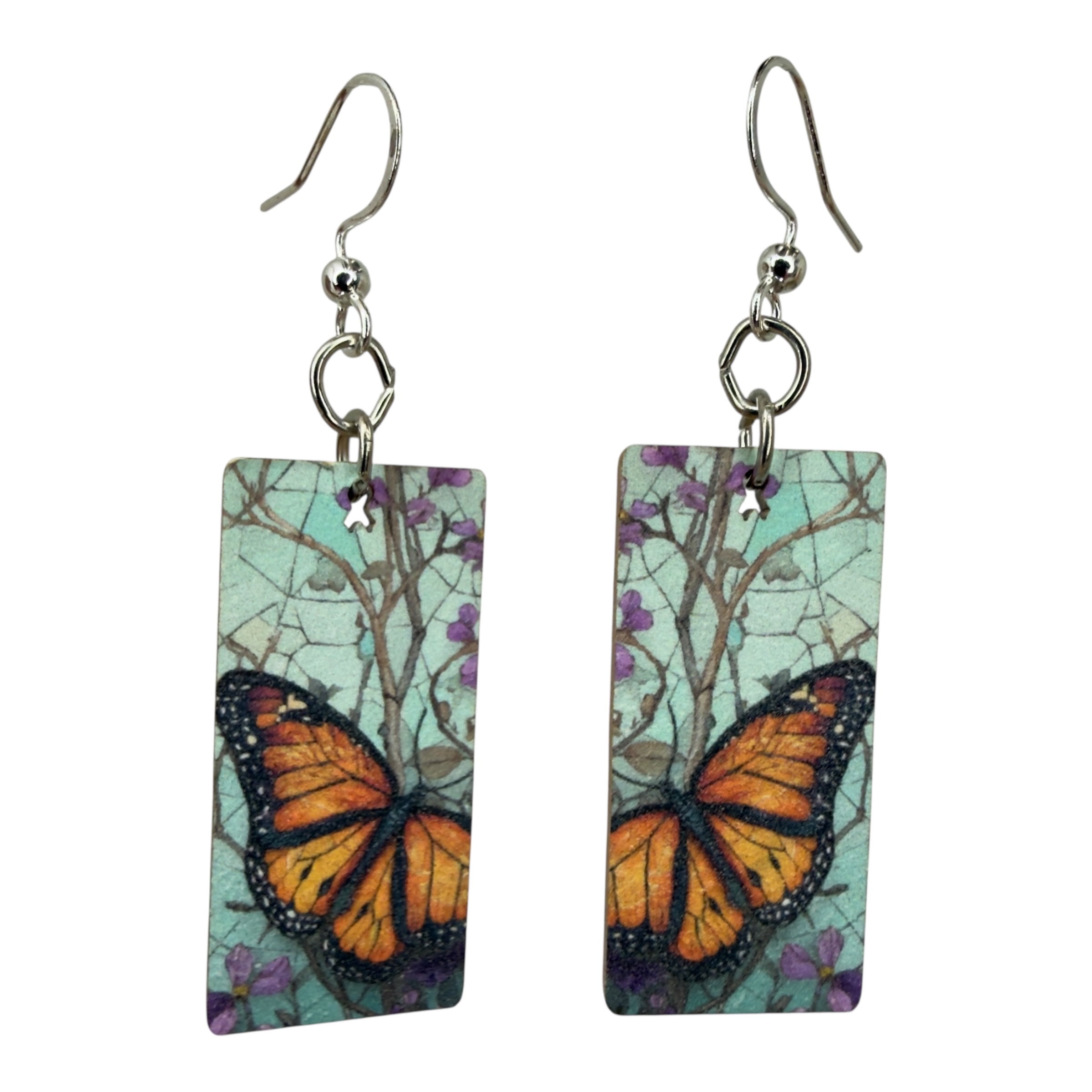 Size: 1.35" H × 0.7" W × 0.1" thick. Material: 100% recycled paperboard with a natural art gallery aesthetic. Ear wires: Silver-finished 304L stainless steel, hypoallergenic. Made in the USA.