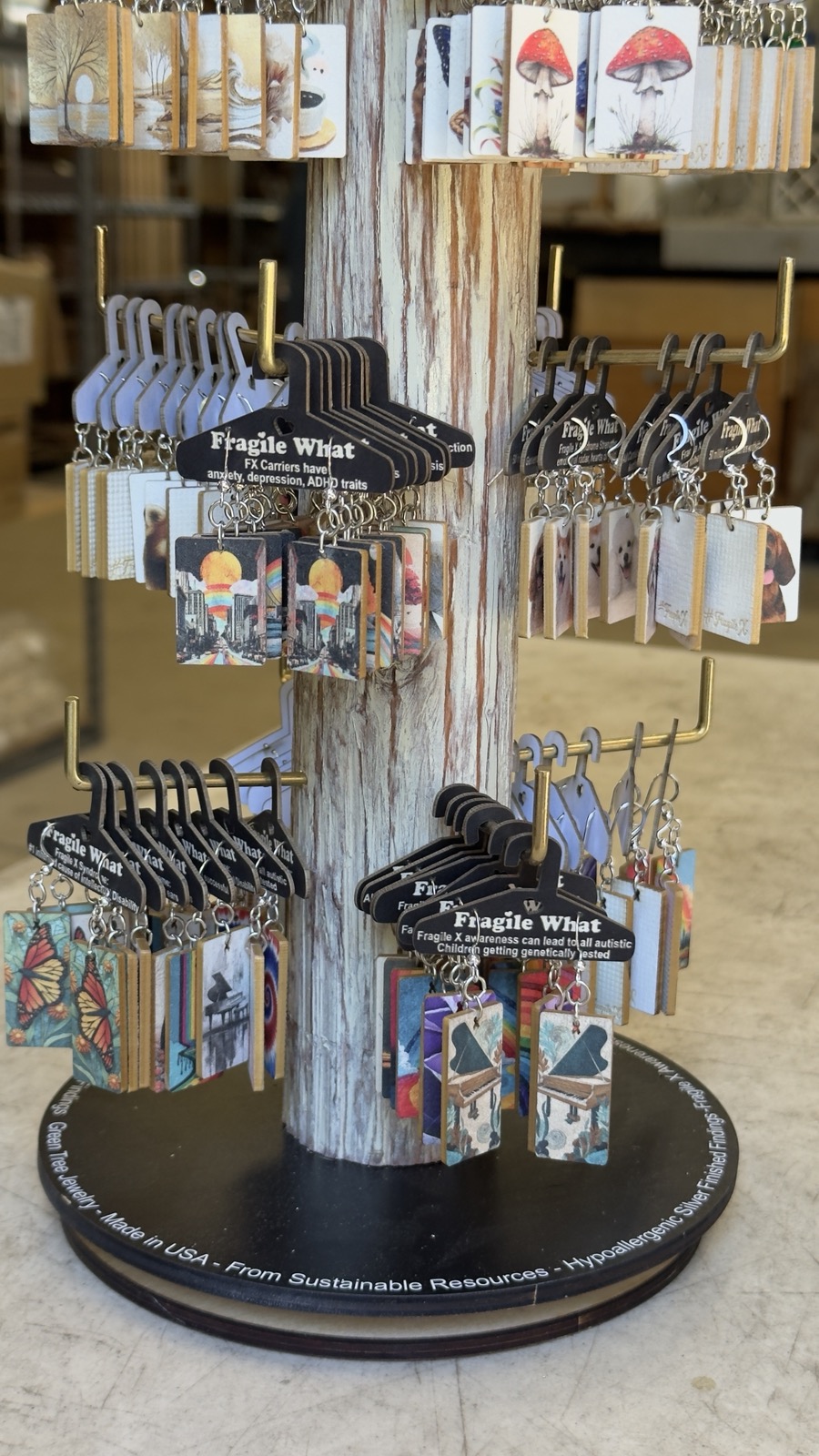 Display: Each pair hangs on a Whimsy Hanger Card with Fragile X awareness messaging — 45 rotating facts that do the storytelling for you.