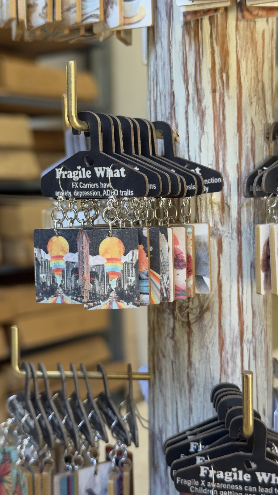 Display: Each pair hangs on a Whimsy Hanger Card with Fragile X awareness messaging — 45 rotating facts that do the storytelling for you.