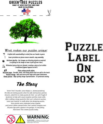 • Each of our puzzles are placed in a cotton drawstring bag (not plastic!) and then packaged inside a cardboard box with an image of the puzzle.