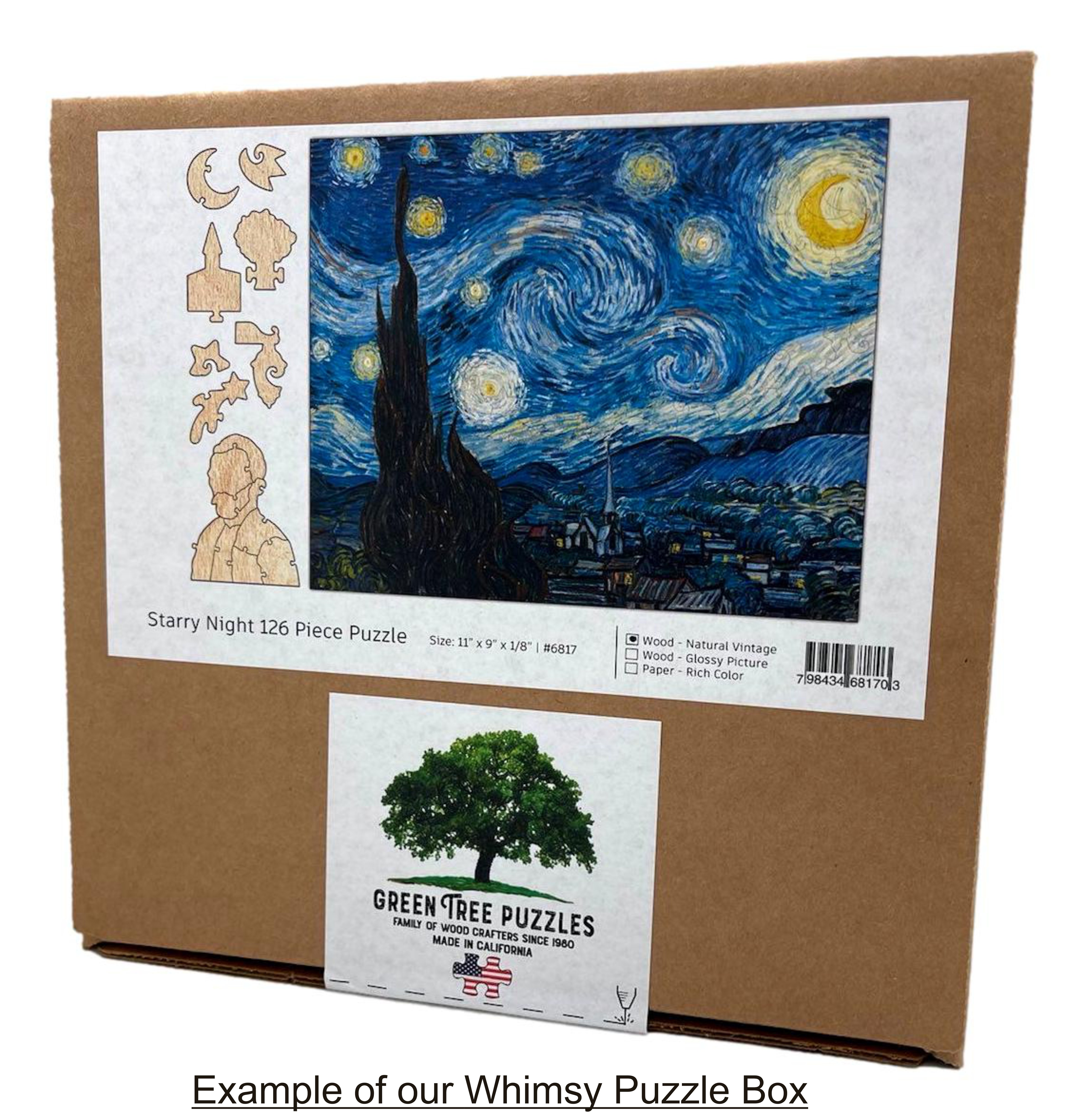 • Each of our puzzles are placed in a cotton drawstring bag (not plastic!) and then packaged inside a cardboard box with an image of the puzzle.