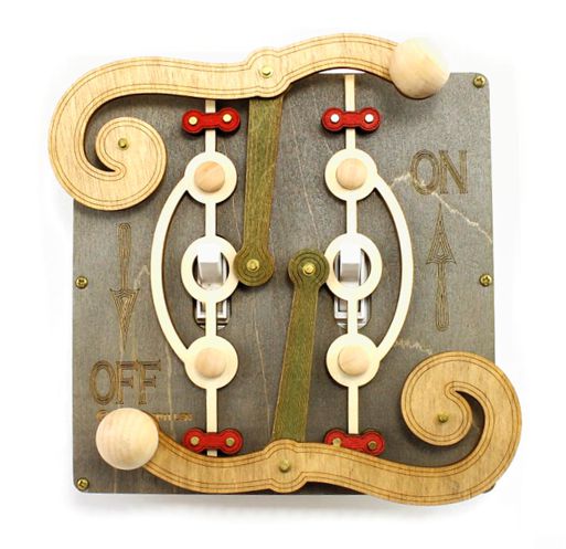 - Light switch cover is completely functional. Gear handle moves rack, turning on and off light switch