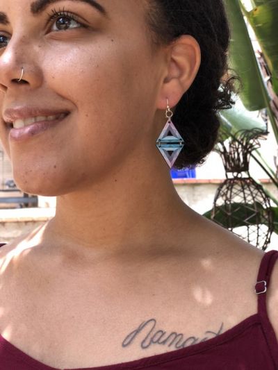 Made In U.S.AStyle # 1583Size 0.7" x 1.4"3D Triangles EarringsA beautiful twist to the strongest shapeMade from sustainably sourced wood and 90% recycled display cards. Laser-cut wood Image on Front with Natural wood backEar wires are silver-finished 304L stainless steel, hypoallergenic, and enhanced with a new, smooth and consistent electrophoretic coating that resists tarnishing.Earrings come as shown